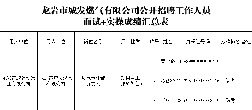 龍巖市政建設(shè)集團(tuán)有限公司公開招聘工作人員面試+實(shí)操成績排名的公示
