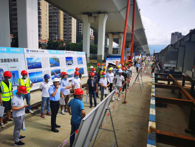 2020年6月28日,由龍巖城市發(fā)展集團(tuán)有限公司主辦,龍巖市政建設(shè)集團(tuán)有限公司(市城投公司)承辦,北京鐵研建設(shè)監(jiān)理有限公司、中國建筑第六工程局有限公司、中冶(上海)鋼結(jié)構(gòu)科技有限公司協(xié)辦的龍巖大道高架橋項(xiàng)目質(zhì)量安全標(biāo)準(zhǔn)化觀摩會(huì)在龍巖大道高架橋主橋鋼箱梁工程現(xiàn)場(chǎng)舉行。觀摩會(huì)分拼裝區(qū)域、提升站區(qū)域、頂推滑移區(qū)域、步履滑移區(qū)域及主橋轉(zhuǎn)體區(qū)域分別展示了龍巖大橋主橋鋼結(jié)構(gòu)拼裝、提升、弧形頂推滑移、步履滑移等新工藝及主塔“水平二次轉(zhuǎn)體”、鋼箱梁頂推、斜拉索施工技術(shù)。