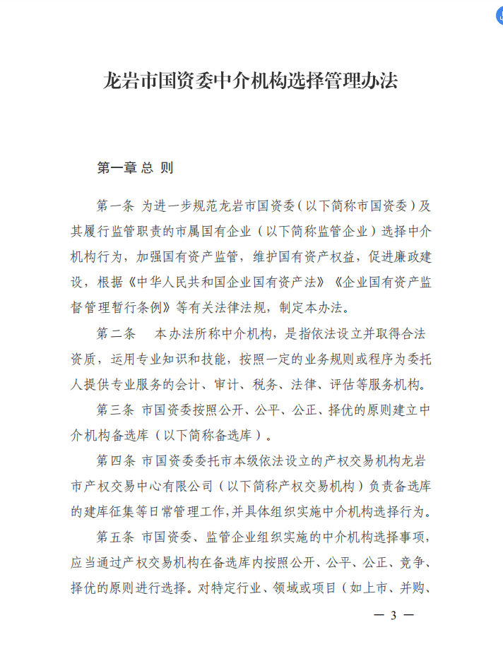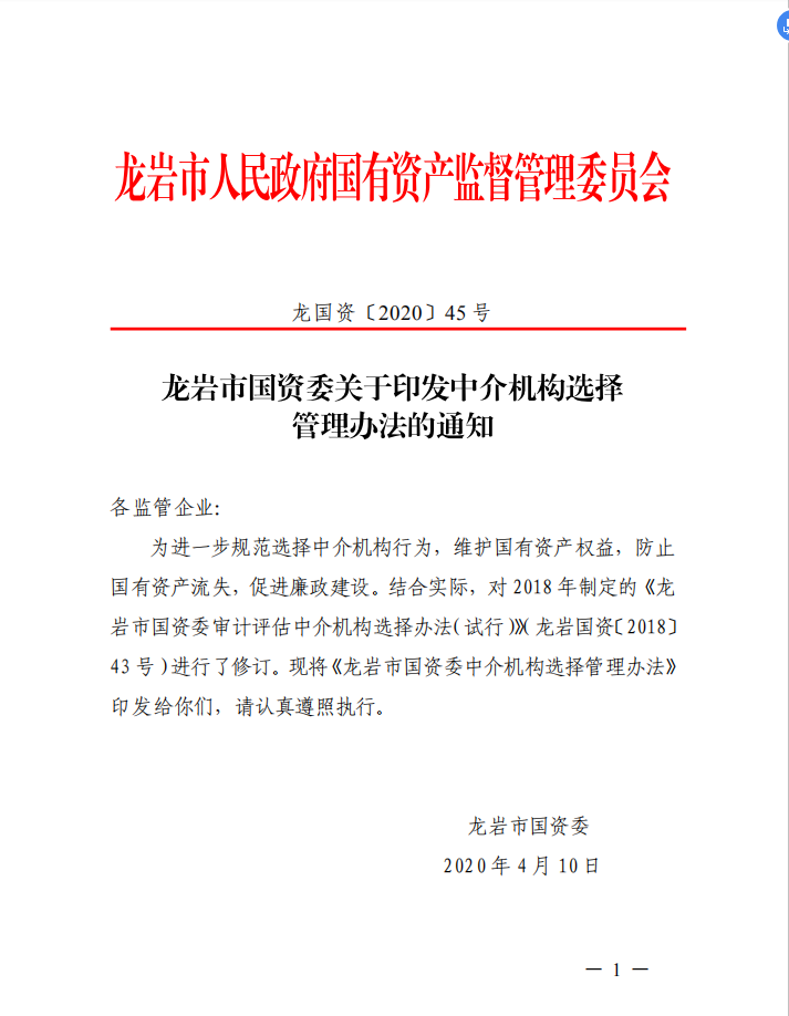 龍巖市國資委關(guān)于印發(fā)中介機(jī)構(gòu)選擇管理辦法的通知(龍國資[2020]45號(hào))