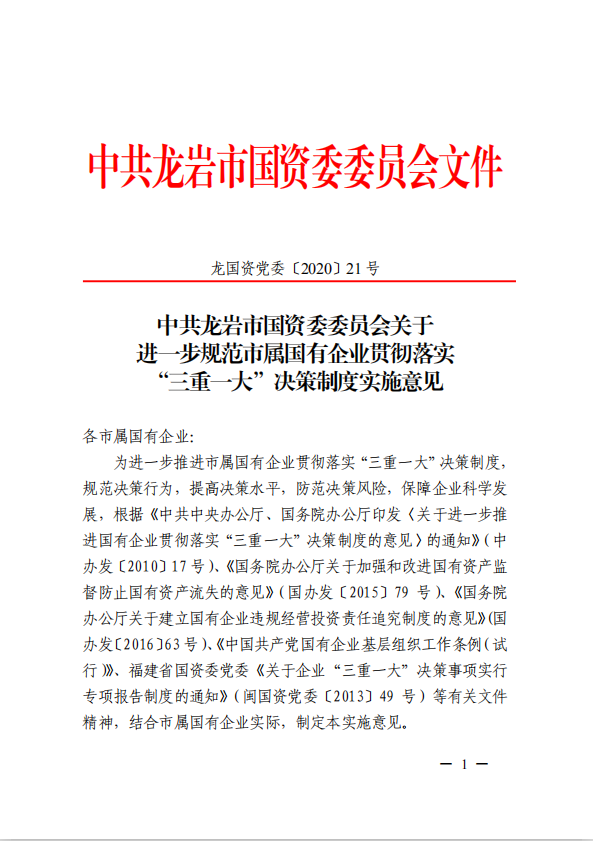 關于進一步規(guī)范市屬國有企業(yè)貫徹落實“三重一大”決策制度實施意見(國資黨委[2020]21號)